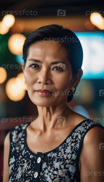 Уверенная в себе женщина 50 лет стоит на размытом городском фоне. Ее уравновешенное выражение лица отражает ее опыт, а мягкое освещение подчеркивает ее вечную красоту и стиль