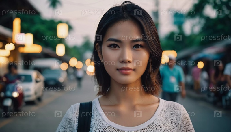 Жительница Таиланда стоит на оживленной улице в сумерках. Атмосфера оживленная, теплые огни освещают сцену, демонстрируя оживленную рыночную среду