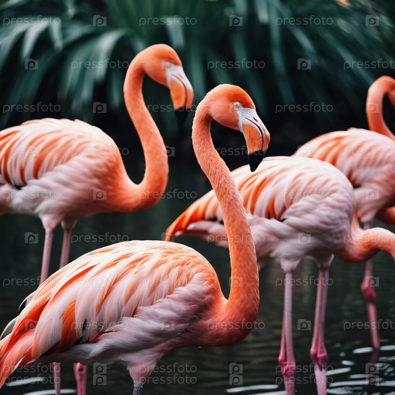 Фламинго собираются в тихом пруду, их оранжевые перья отражаются в воде. Они игриво взаимодействуют, создавая потрясающее зрелище природы. Фламинго Phoenicopterus — род птиц. Генеративный ИИ