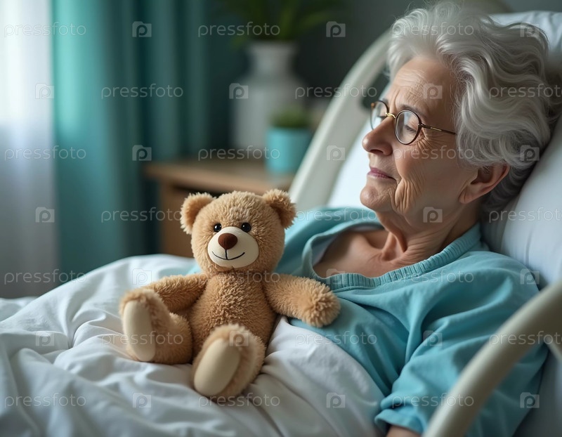Пожилая женщина лежит на больничной койке, прижимая к груди мягкого плюшевого мишку