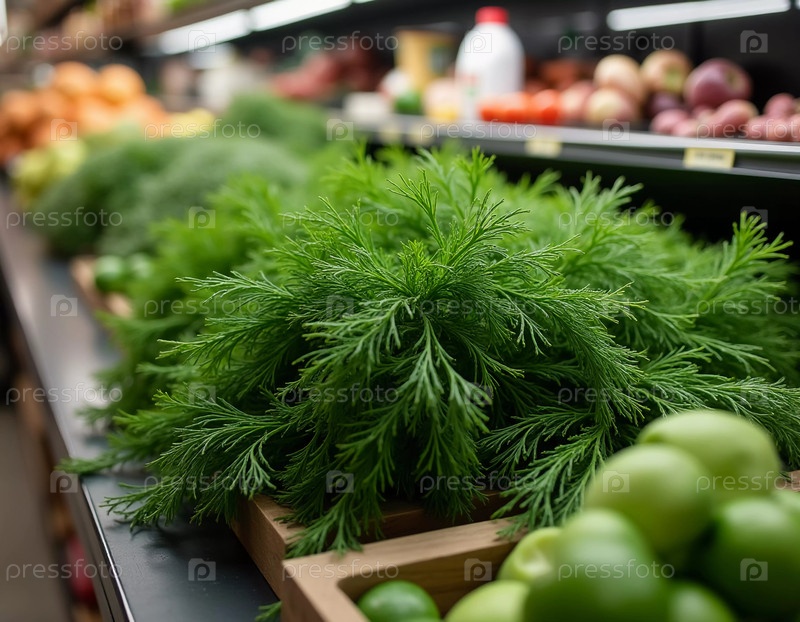 Яркая зелень укропа привлекает внимание в продуктовом отделе супермаркета, окруженная разнообразными свежими овощами и фруктами, создавая насыщенные сенсорные ощущения