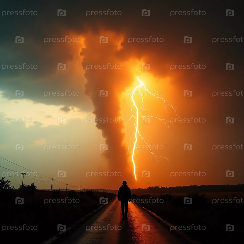 Одинокая фигура стоит на мокрой дороге, завороженная мощным природным явлением торнадо и зубчатыми молниями, освещающими темное небо в сумерках. Генеративный ИИ