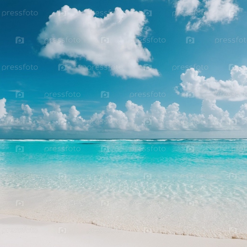 Захватывающий вид на нетронутый белый песчаный пляж на Мальдивах. Бирюзовые воды Индийского океана нежно плещутся у берега, создавая безмятежную идиллическую картину. Небо ярко-голубое, усеянное пушистыми белыми облаками