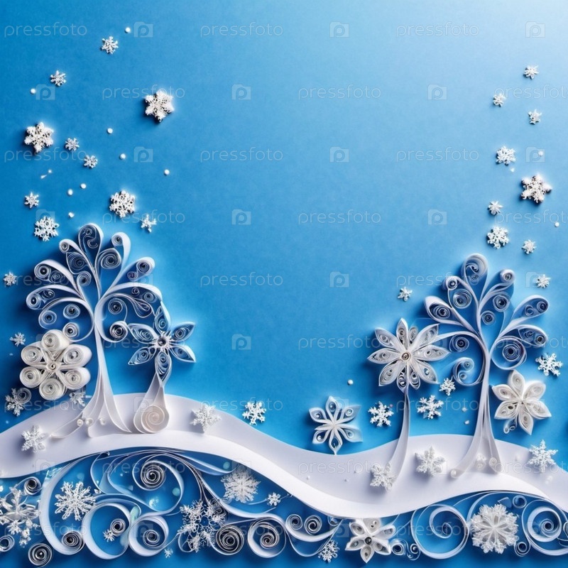 Крупный план бумажной работы в технике квиллинга, изображающей зимнюю сцену. Работа представляет собой завитки из белой бумаги, расположенные так, чтобы сформировать снежный пейзаж с деревьями и декоративной аркой из снежинок. Копировальное пространство.