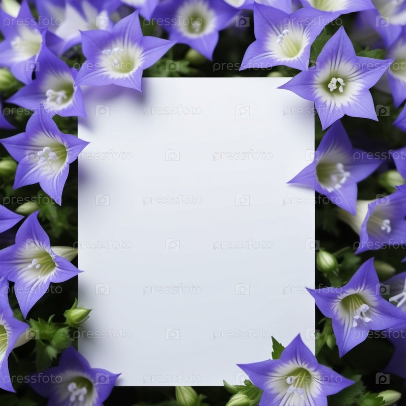 Чистый лист бумаги, окруженный рамкой из фиолетовых или синих колокольчиков. Цветы, расположенные вокруг бумаги, создают естественную красивую границу. Фон или шаблон для различных целей, пространство для копирования