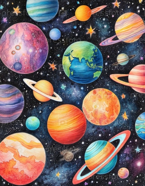 Планетарная система с несколькими планетами, большим ярко окрашенным газовым гигантом и каменистой планетой. Яркие звезды и огромное пространство темного космоса с галактикой на заднем плане. Космические просторы. Космонавтика. ИИ