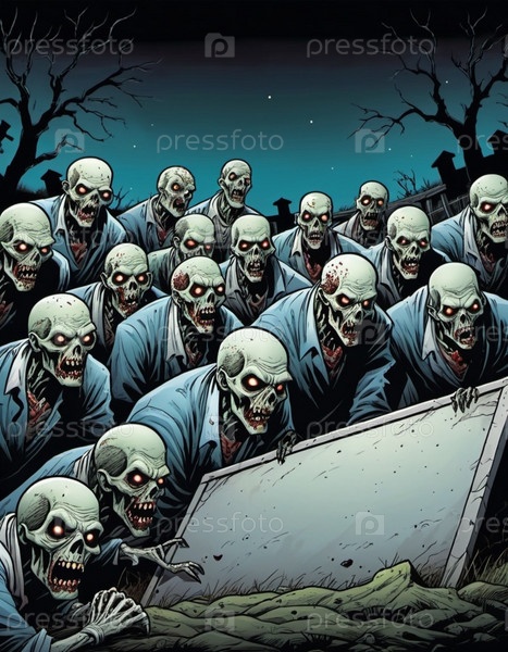 Большая группа зомби, чьи лица искажены выражением голода и разложения, держат пустой знак, их бледная, разлагающаяся кожа и пятна крови видны. Мертвые восстают на кладбище ночью. AI