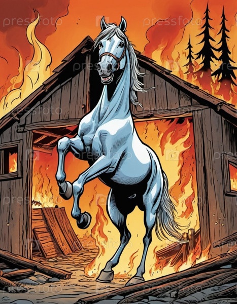 Конь встает на дыбы среди сильного пламени и густого дыма, которые окутывают деревянную избу. Огонь потрескивает. Русская пословица: есть в русских деревнях женщины, которые могут остановить коня на скаку и войти в горящую избу