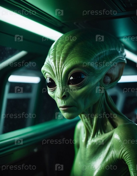 Встреча с инопланетянами в пустоте на борту футуристического космического корабля во время межзвездного путешествия через глубокий космос, раскрывающая таинственное существо. Генеративный ИИ