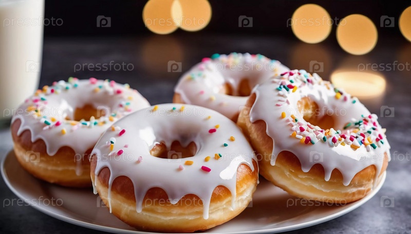 Вкусный ассортимент ванильных пончиков, покрытых кремовой глазурью и разноцветной посыпкой, демонстрирующих свою привлекательную текстуру и сладость в теплой обстановке кафе. Белая глазурь на булочках. Генеративный ИИ