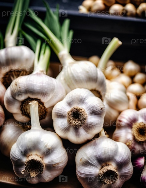 На прилавке супермаркета выложены свежие крупные головки чеснока, привлекательно разложенные, привлекающие покупателей своим ярким внешним видом и насыщенным ароматом. Покупатели ищут кулинарное вдохновение. Генеративный ИИ