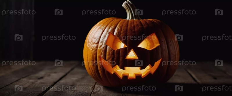 Вырезанная тыква на Хэллоуин имеет угрожающее лицо, подсвеченное изнутри, с дымом, поднимающимся вверх, что усиливает тревожную атмосферу вечера. Генеративный ИИ
