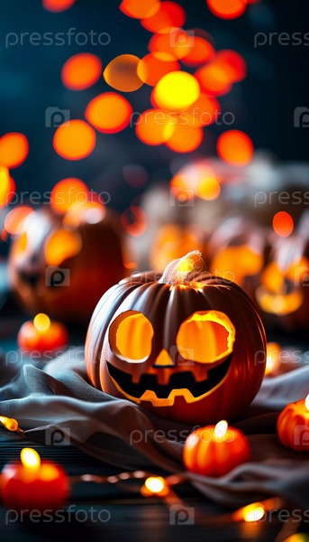 В этот Хэллоуин резная тыква излучает теплое свечение, окруженная маленькими тыквами и красочными осенними листьями, а на заднем плане мерцают праздничные огни. Генеративный ИИ