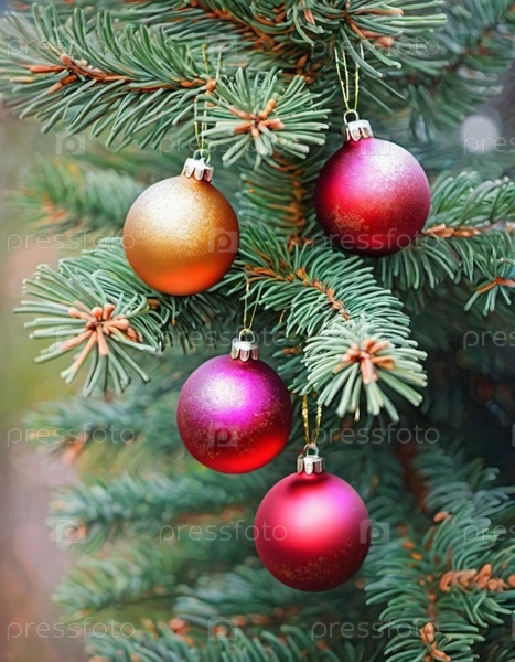 Красочные рождественские украшения украшают ветви ели, яркие шары в оттенках красного, золотого и розового, олицетворяющие праздничное настроение зимой. Художественный фон Happy New Year. Генеративный ИИ