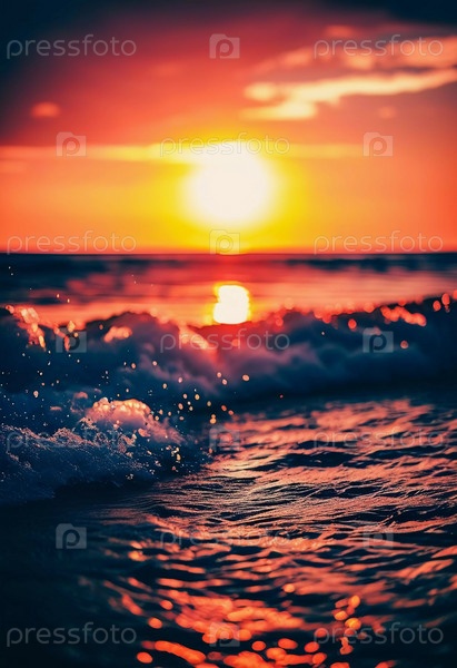 Теплое сияние заходящего солнца отбрасывает золотистые оттенки на спокойные волны океана, создавая безмятежную атмосферу на берегу в сумерках. Закат или восход солнца на море. Романтический пейзаж. AI