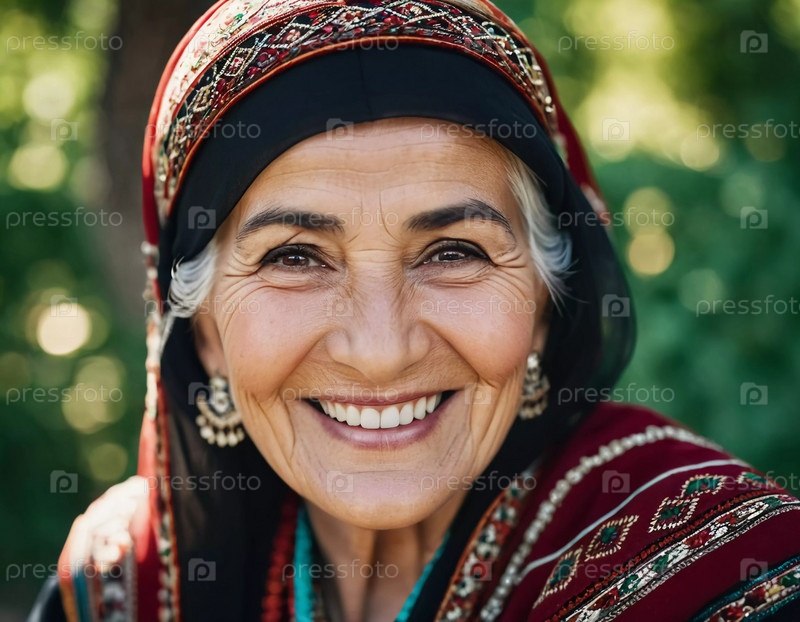 Зрелая таджикская женщина 75 лет улыбается, демонстрируя сложную традиционную одежду и богатое культурное наследие своей национальности, пробуждая мудрость и изящество. Брюнетка, в платке. AI