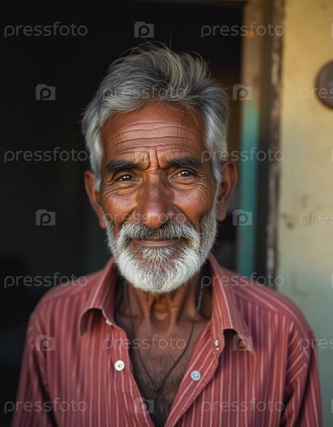 Пожилой мужчина из Индии излучает радость теплой улыбкой и мерцающими глазами. Его седые волосы и борода отражают мудрость его лет, демонстрируя жизнь, богатую опытом. Генеративный ИИ
