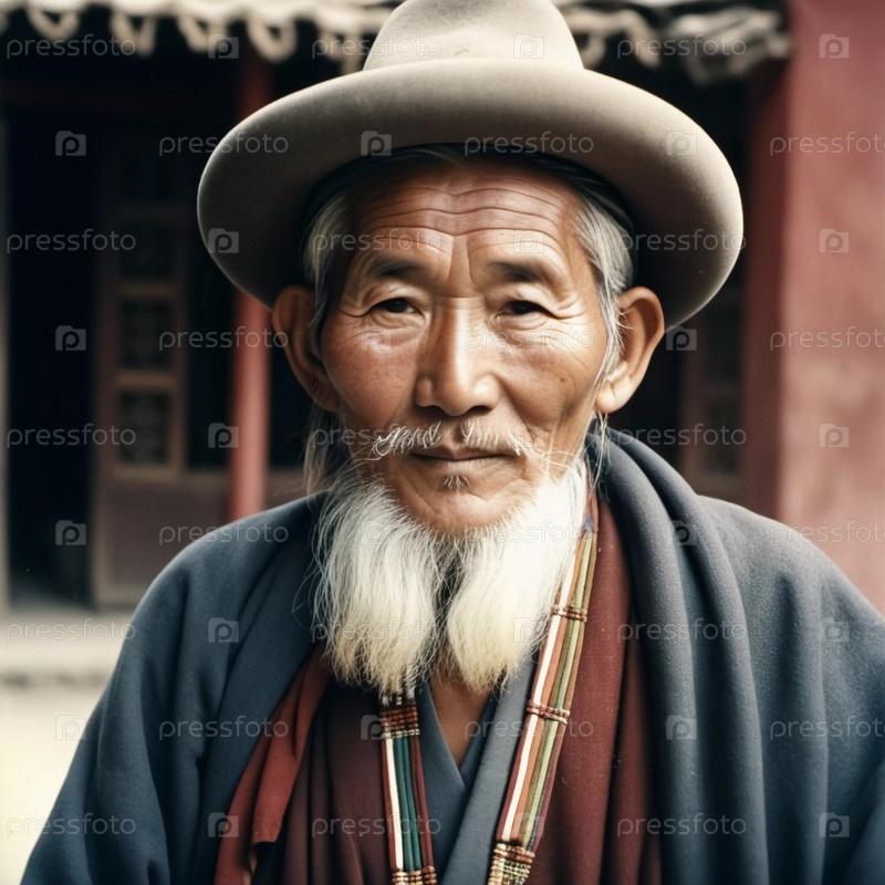 Традиционный пожилой тибетский мужчина 70 лет с отличительными чертами лица позирует на деревенском фоне, отражая его богатую культурную идентичность и наследие. Мудрый серьезный прямой взгляд. Генеративный ИИ