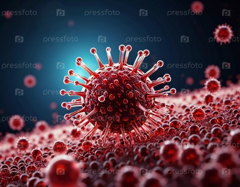 Яркая визуализация ВИЧ, демонстрирующая множественные вирусные частицы. Сложные структуры выделены на темном фоне, подчеркивая их сложность. Вирусология как наука. Генеративный ИИ
