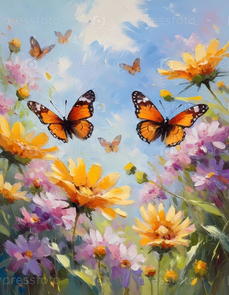 Красочные бабочки грациозно порхают над яркими полями, создавая живую и радостную атмосферу на залитом солнцем лугу. Генеративный ИИ