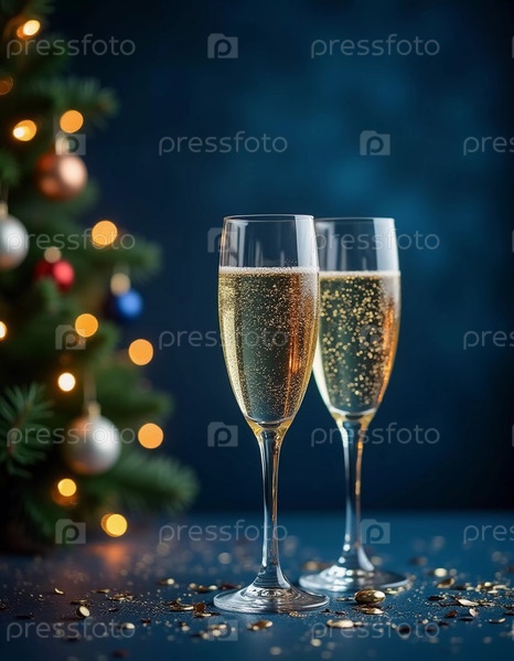 Два сверкающих бокала шампанского элегантно стоят на фоне украшенной рождественской елки, передавая дух праздника золотым мерцанием. Генеративный ИИ