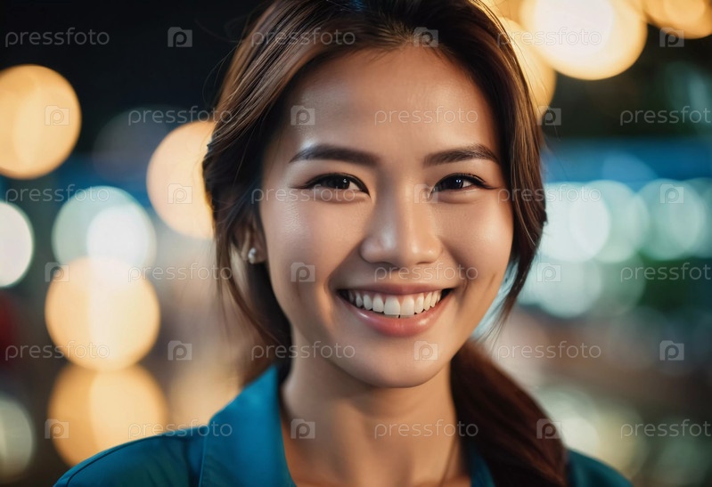 Веселая женщина в Таиланде широко улыбается, наслаждаясь оживленным вечером в окружении мягких, красочных огней. Ее выражение лица отражает радость и удовлетворение. Генеративный ИИ