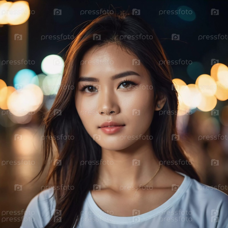 Молодая женщина стоит на оживленной уличной сцене в Таиланде вечером. Мягкий свет освещает ее лицо, пока она задумчиво смотрит, улавливая атмосферу момента
