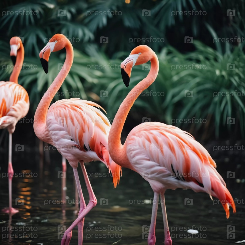 Фламинго собираются в тихом пруду, их оранжевые перья отражаются в воде. Они игриво взаимодействуют, создавая потрясающее зрелище природы. Фламинго Phoenicopterus — род птиц. Генеративный ИИ
