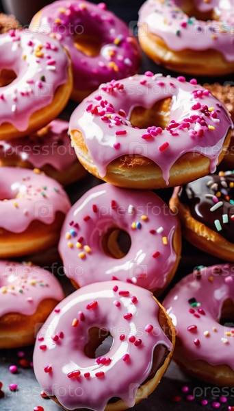 Очаровательные пончики с розовой клубничной глазурью выставлены на деревенском деревянном фоне. Посыпка и украшения из конфет добавляют яркие цвета, создавая праздничное угощение. Генеративный ИИ