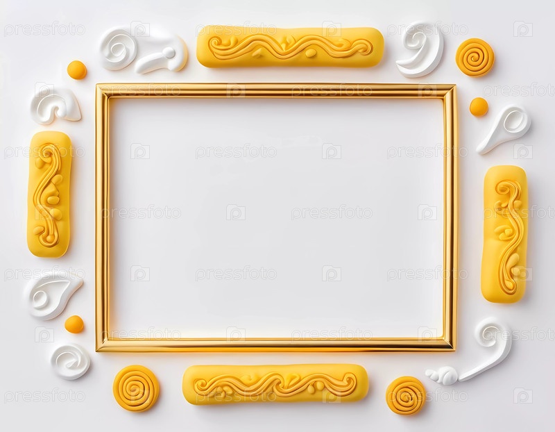 Прямоугольная рамка стоит пустая, окруженная замысловатыми золотисто-желтыми и белыми декоративными элементами. Фон мягкий белый, подчеркивающий элегантность рамки