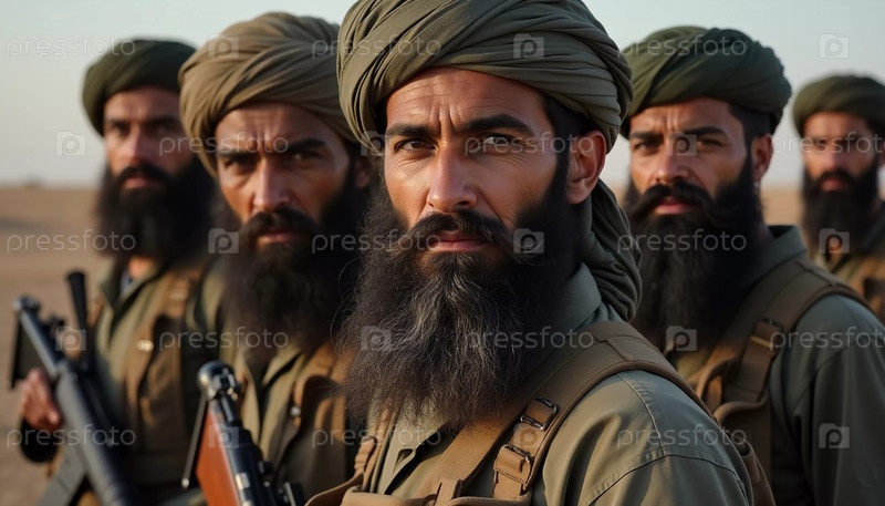 Группа вооруженных мужчин, одетых в традиционную одежду, стоит сплоченно, демонстрируя товарищество и готовность. Воинствующие мусульмане, похожие на Талибан или пакистанскую армию. Густая борода. Генеративный ИИ