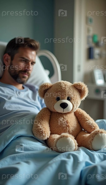 В больничной палате усталый мужчина отдыхает в постели, прижимая к себе плюшевого мишку, который символизирует любовь и надежду. Мягкая игрушка дарит утешение среди медицинских проблем, создавая трогательный момент