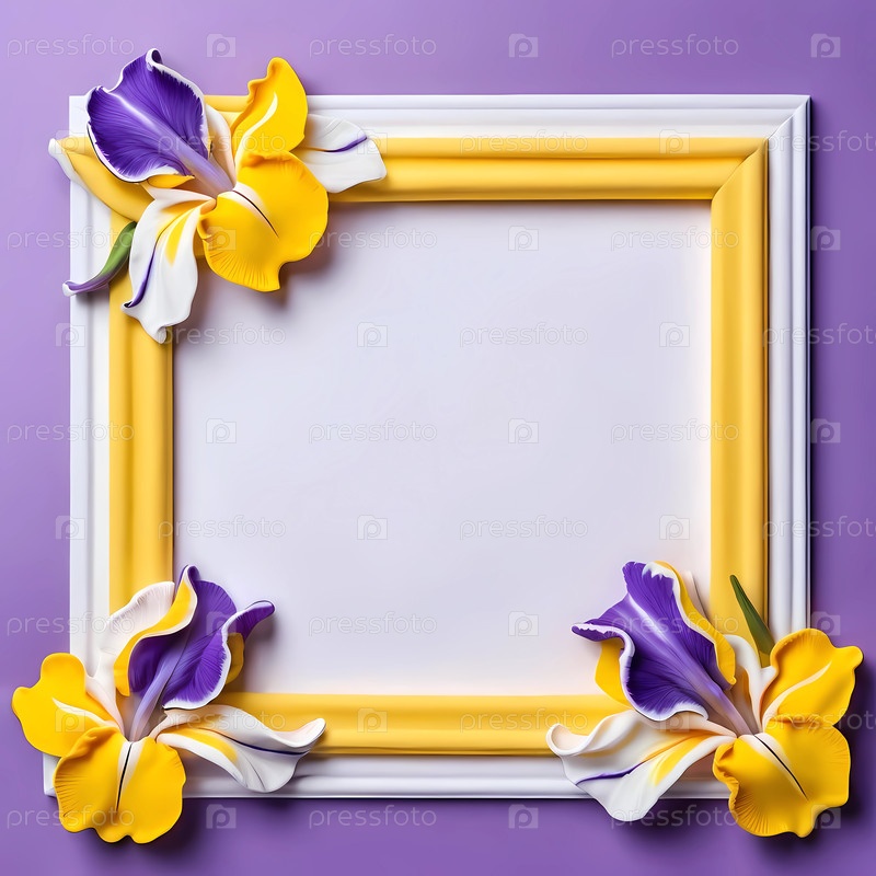 Декоративная рамка взрывается желтыми и фиолетовыми цветами ириса на завораживающем фиолетовом фоне. Пустой центр приглашает к личному самовыражению и художественному видению