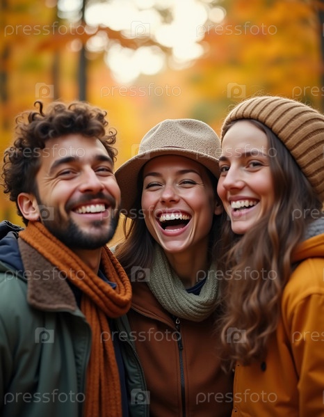 Радостные друзья исследуют красоту осени, наслаждаясь смехом и создавая незабываемые воспоминания среди яркой листвы в объятиях природы
