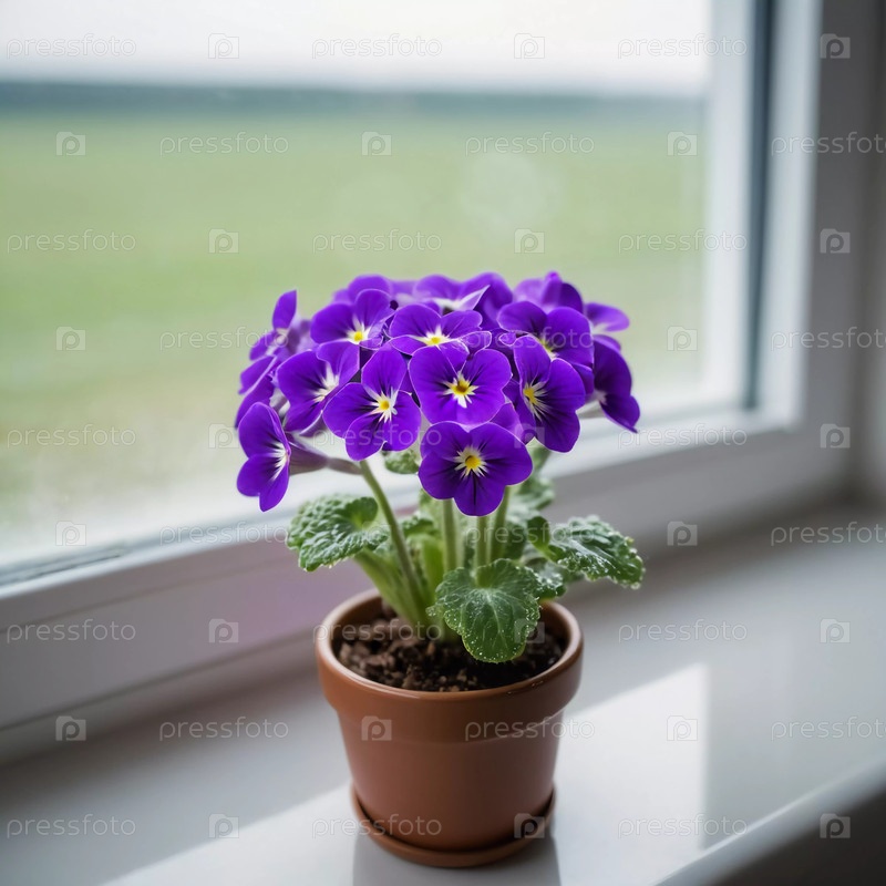 Букет пышных фиолетовых цветов покоится в простом коричневом горшке на подоконнике, залитом мягким естественным светом, с видом на спокойный открытый пейзаж за пределами Генеративный ИИ
