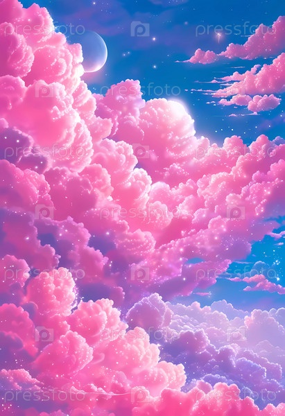 Красивые розовые пушистые облака в ярком закатном небе. Визуальное отображение. Драматическое нереальное небо с кучевыми и слоистыми облаками в атмосфере. Неизвестная планета с розовыми облаками. Луна, планеты и звезды. Искусство ИИ