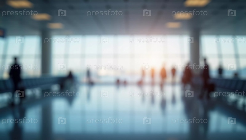 Толпы путешественников перемещаются по просторному терминалу аэропорта, занимаясь различными делами и готовясь к предстоящим рейсам в утреннем или вечернем свете. Расфокусированное боке. Генеративный ИИ