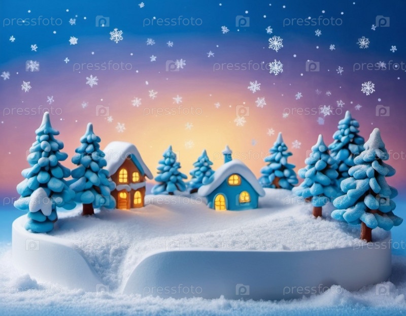 Причудливая деревня, пряничный домик, заснеженные крыши, окна и дымоход. Дом окружен снегом и снежинками. Синий фон боке. Праздничная и очаровательная зимняя страна чудес. Создано с помощью ИИ