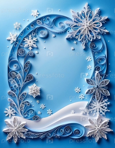 Крупный план бумажной работы в технике квиллинга, изображающей зимнюю сцену. Работа представляет собой завитки из белой бумаги, расположенные так, чтобы сформировать снежный пейзаж с деревьями и декоративной аркой из снежинок. Копировальное пространство.