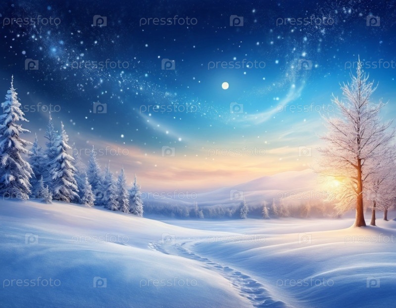 Живописная зимняя сцена с заснеженной равниной и силуэтами деревьев на фоне яркого ночного неба. Мягкий снегопад добавляет волшебный штрих, создавая спокойный и захватывающий дух пейзаж. Сгенерированный ИИ