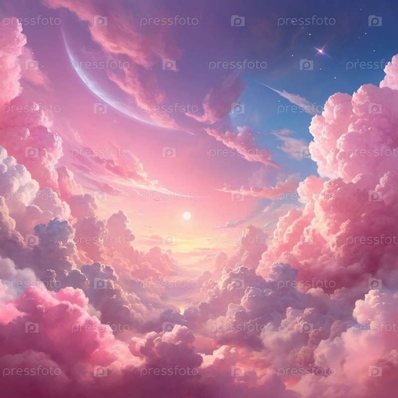 Красивые розовые пушистые облака в ярком закатном небе. Визуальное отображение. Драматическое нереальное небо с кучевыми и слоистыми облаками в атмосфере. Неизвестная планета с розовыми облаками. Луна, планеты и звезды. Искусство ИИ