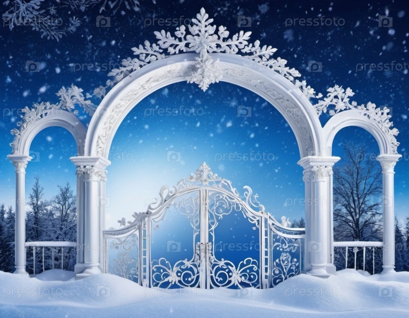 Изысканная арка в зимней сказке. Замысловатая резьба и дизайн снежинок. Две белые колонны. Снег мягко падает вокруг арки, создавая волшебную и неземную атмосферу. Небо темно-синее. ИИ
