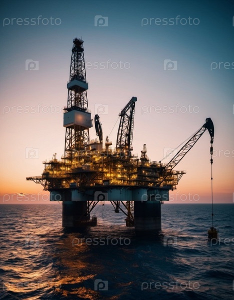 Большая, освещенная морская нефтяная вышка возвышается в воде в сумерках. Огни вышки отбрасывают теплый свет на темнеющее небо, а силуэт платформы обрамлен рябью воды. AI
