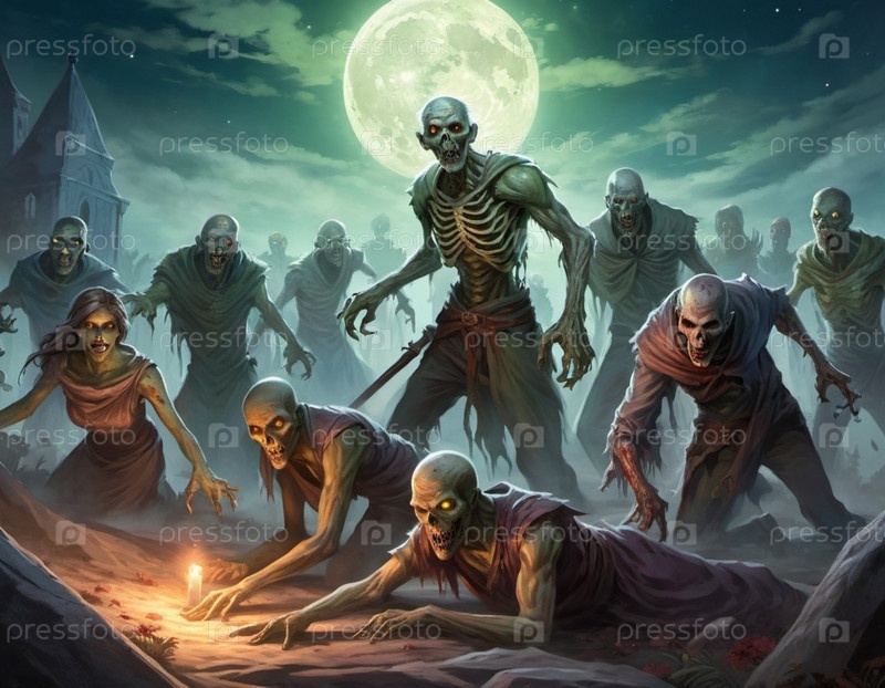 Гротескные зомби появляются из могил, разложившиеся тела освещаются лунным светом. Скелетные фигуры бродят среди надгробий, в то время как другие ползают по земле, демонстрируя свой ужасный вид. ИИ