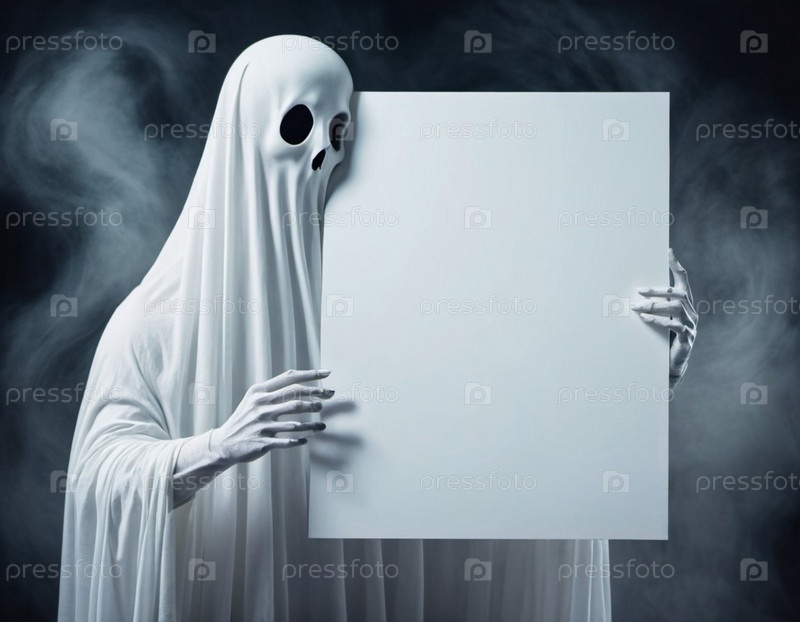 Призрак держит белый пустой плакат. Призрачная фигура, одетая в белую простыню, держит пустой знак на туманном фоне. Лицо призрака, похожее на череп. Жутковатое изображение. Свободное место для надписи. Сгенерировано ИИ