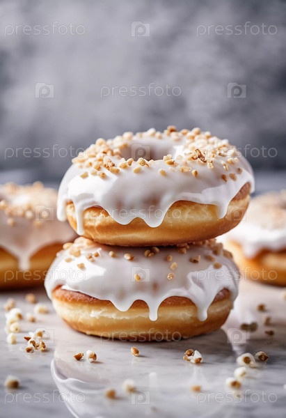 Вкусный ассортимент ванильных пончиков, покрытых кремовой глазурью и разноцветной посыпкой, демонстрирующих свою привлекательную текстуру и сладость в теплой обстановке кафе. Белая глазурь на булочках. Генеративный ИИ