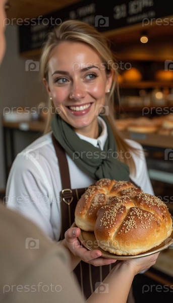 Улыбающийся пекарь держит теплую, хрустящую буханку хлеба в очаровательной пекарне, наполненной разнообразной выпечкой. Атмосфера располагает, подчеркивая утреннюю свежесть. Генеративный ИИ