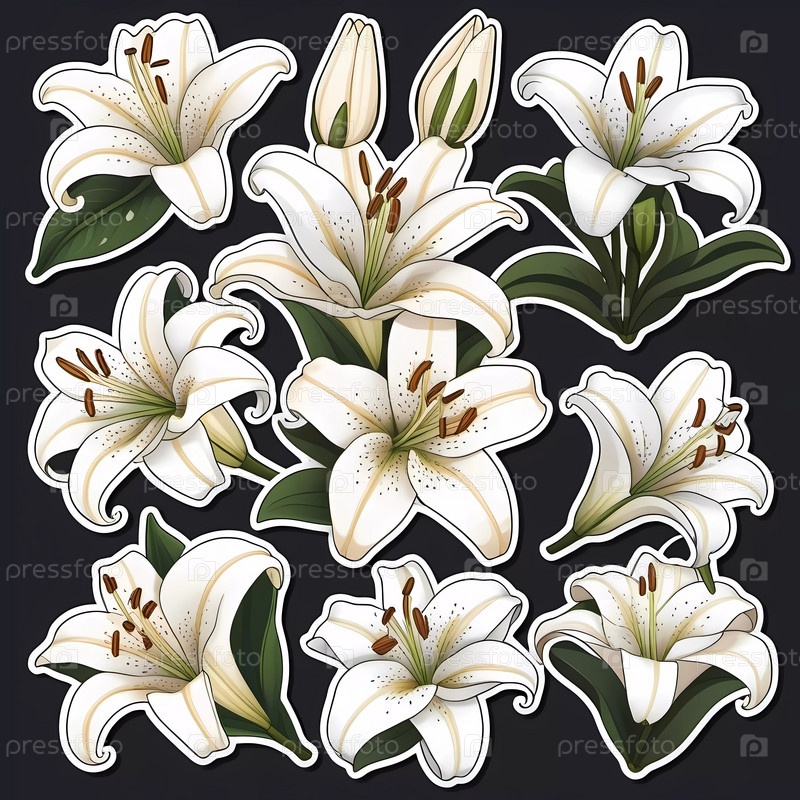 Потрясающий ассортимент белых лилий с различными стадиями цветения представлен на контрастном черном фоне, подчеркивающем их элегантность и красоту. Генеративный ИИ