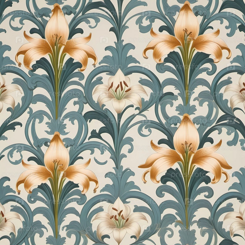 Эти красивые обои демонстрируют замысловатые цветочные узоры с синими и золотыми лилиями на мягком фоне, идеально подходящие для улучшения декора любой комнаты. Генеративный ИИ