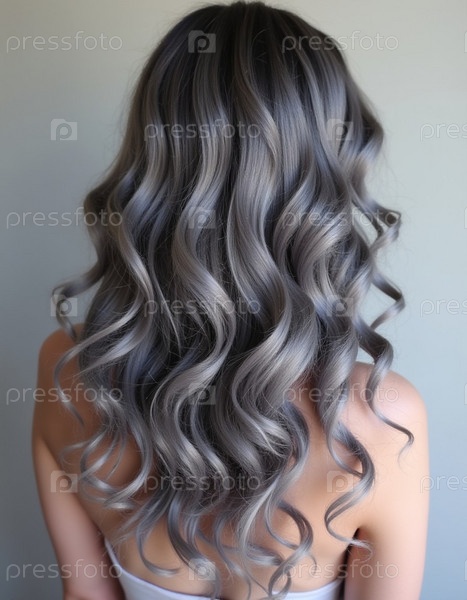 Крупный план демонстрирует красивые, блестящие серые пепельные локоны, которые демонстрируют потрясающую текстуру и яркий блеск, подчеркнутый мягким освещением. Замысловатые локоны красиво обрамляют голову. Генеративный ИИ